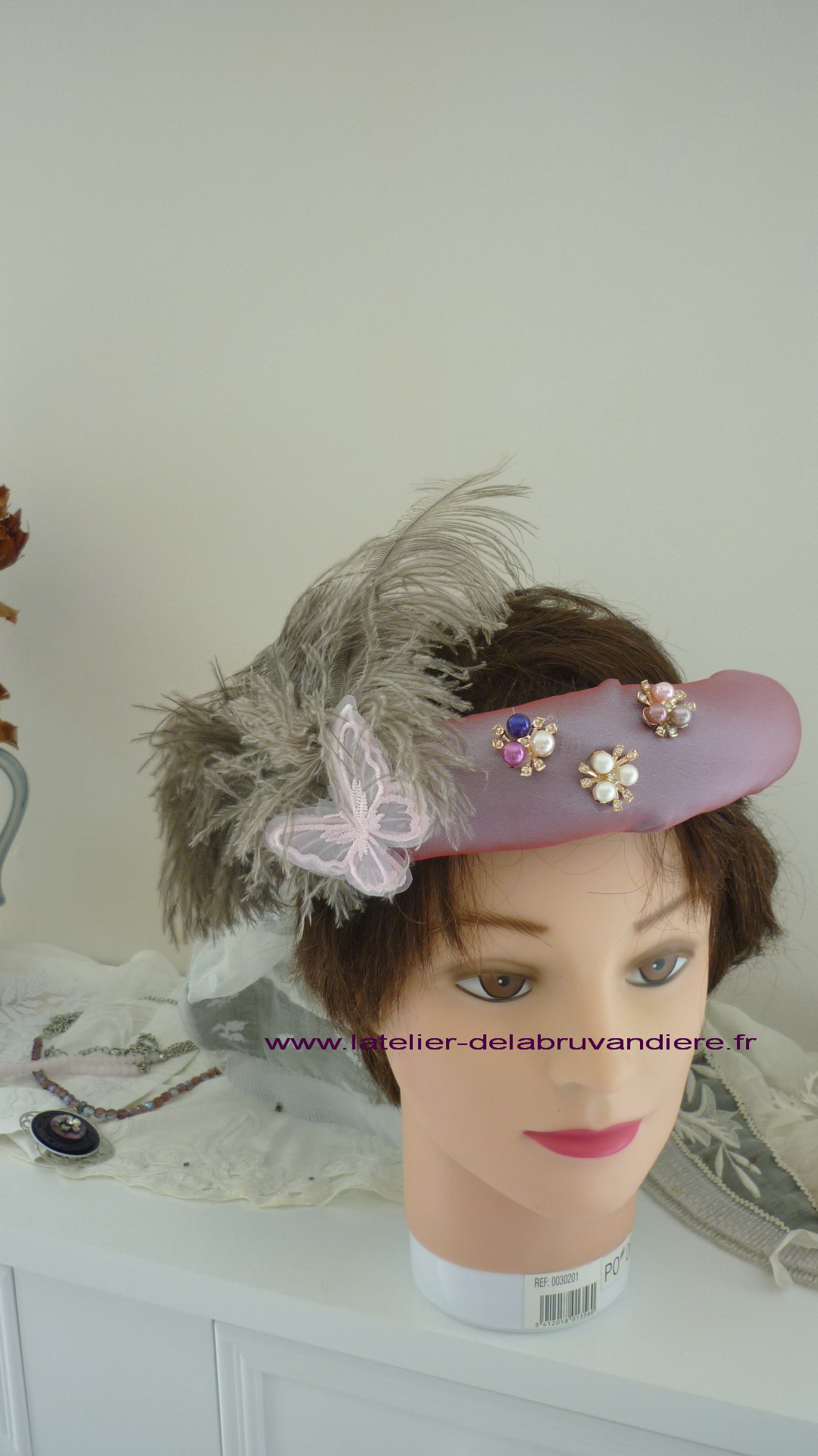 en paille garni de fleurs et ruban. sac en taffetas prune, coiffe en taffetas