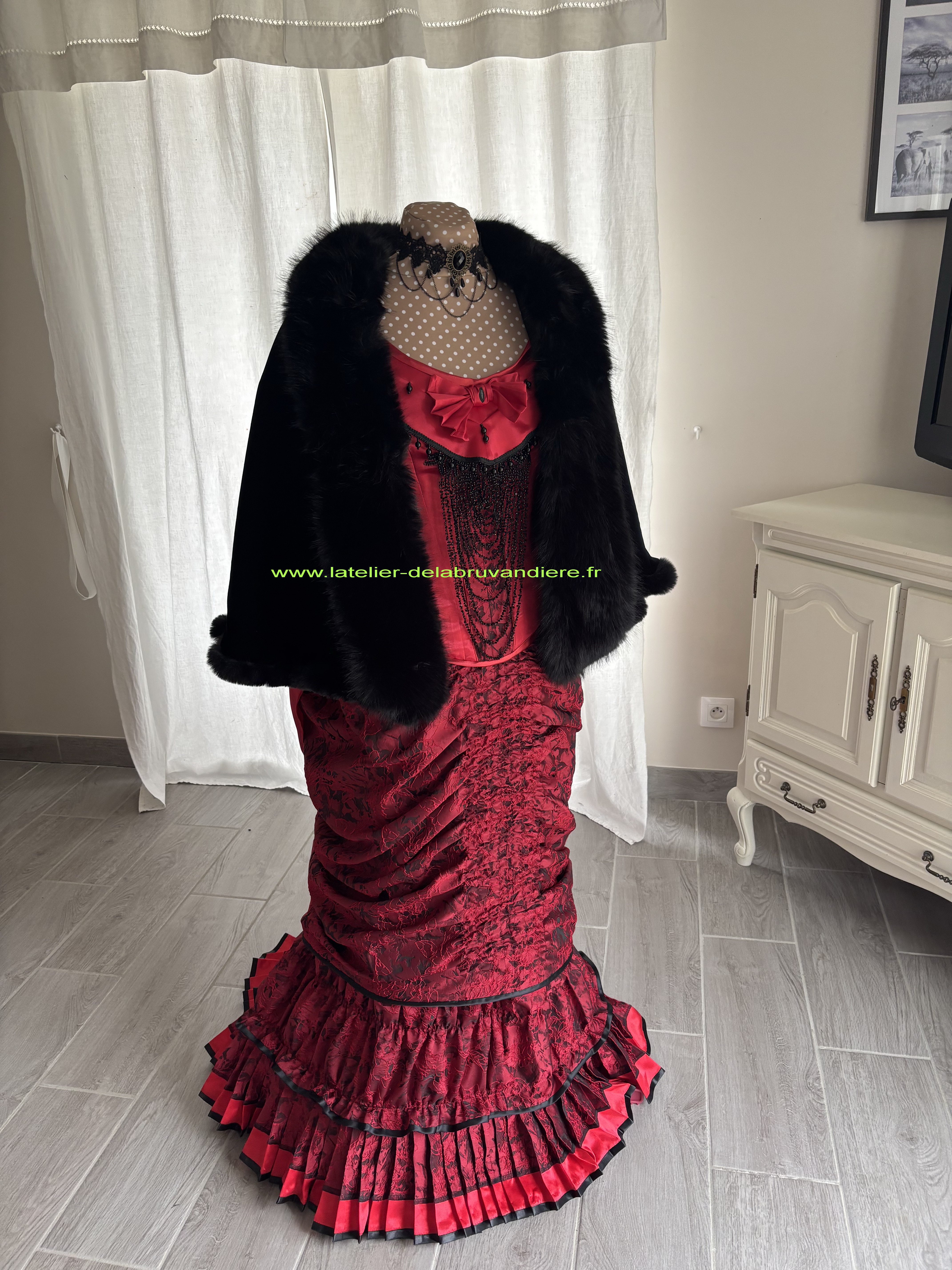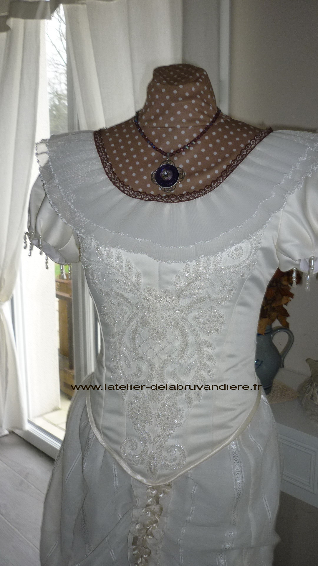et bordé de dentelle blanche. La veste, la tournure et le tablier sont