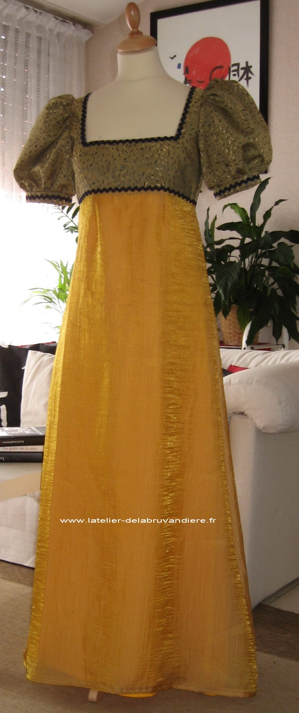 Robe en voile satiné ton ocre et damas kaki et bleu.. La coupe est très