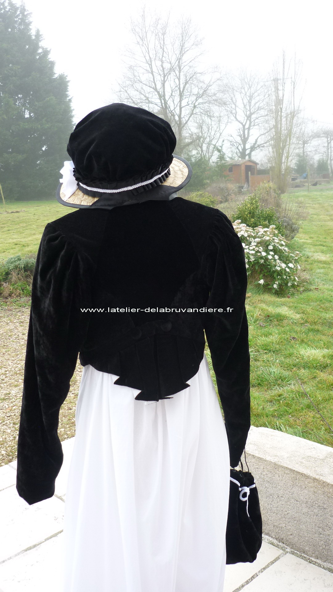 en velours noir doublé en plumetis blanc, avec un peplum et deux