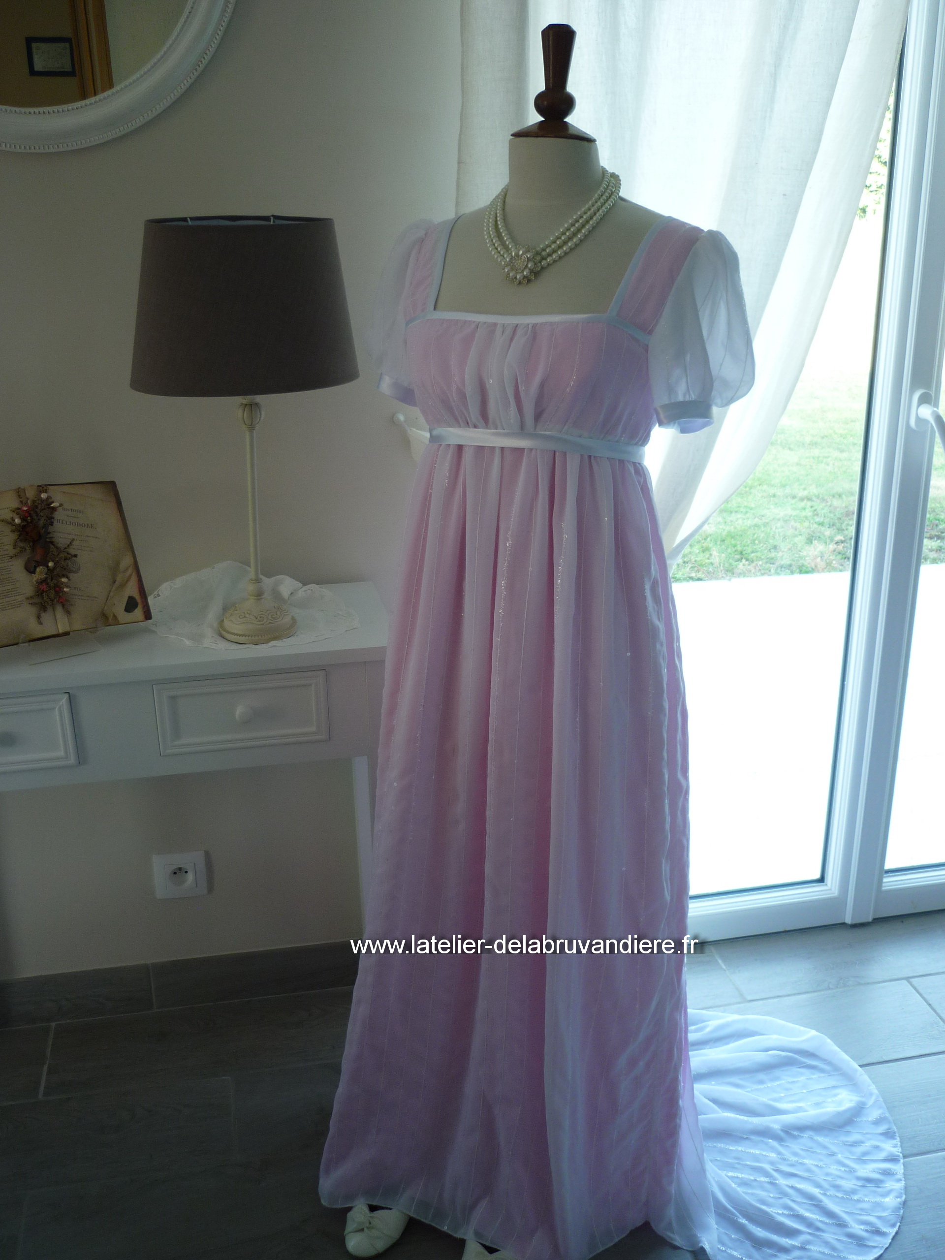 dessous de robe en satin rose, dessus en mousseline blanche avec traine.