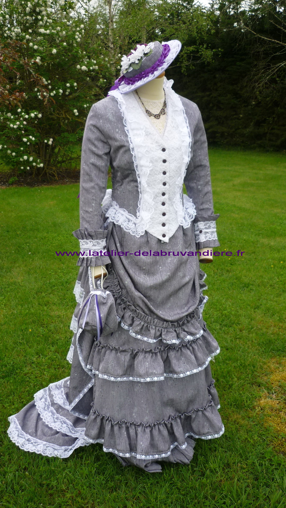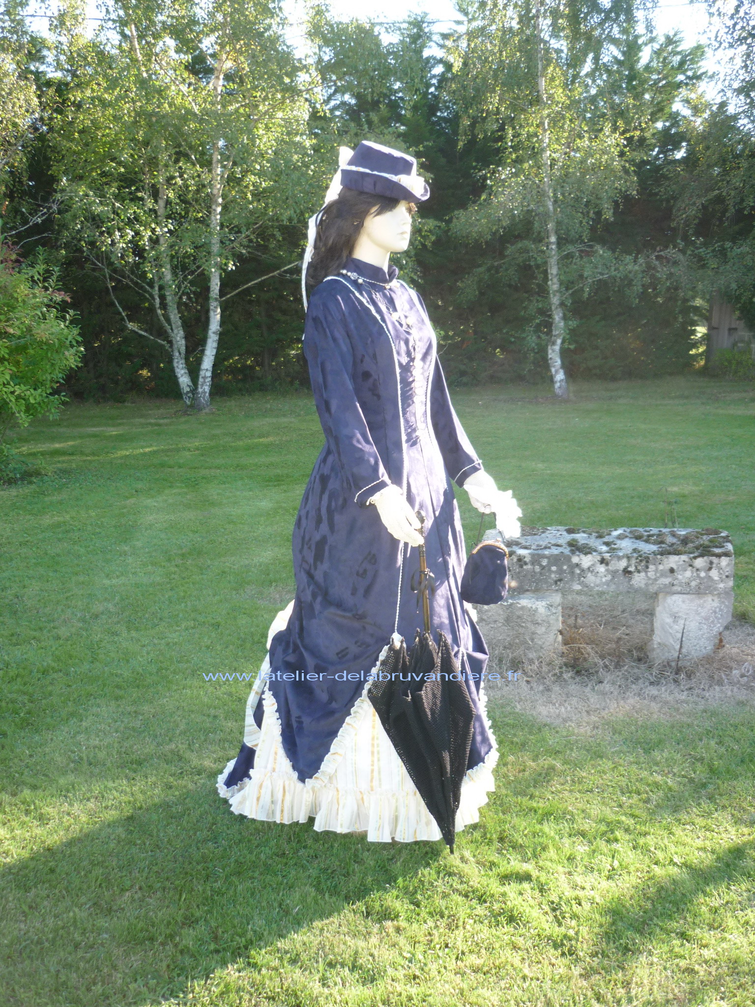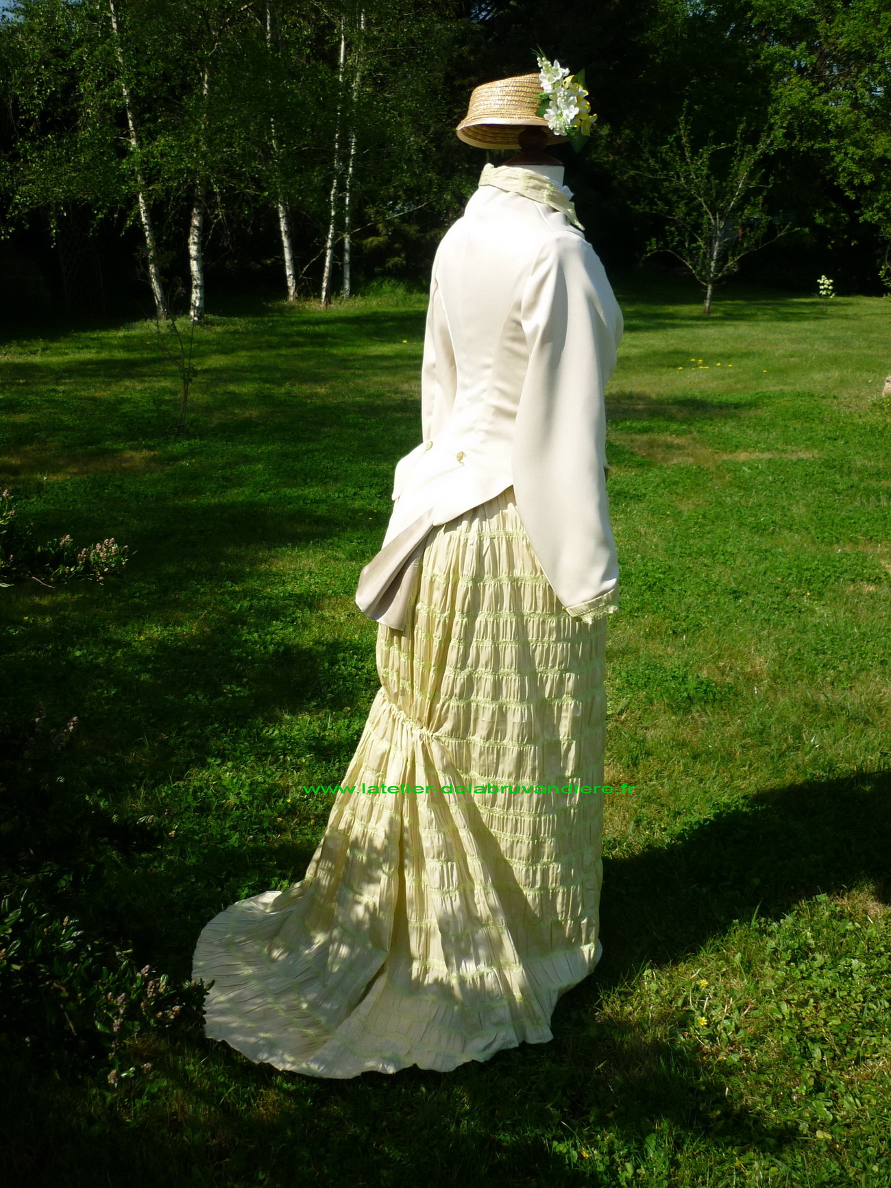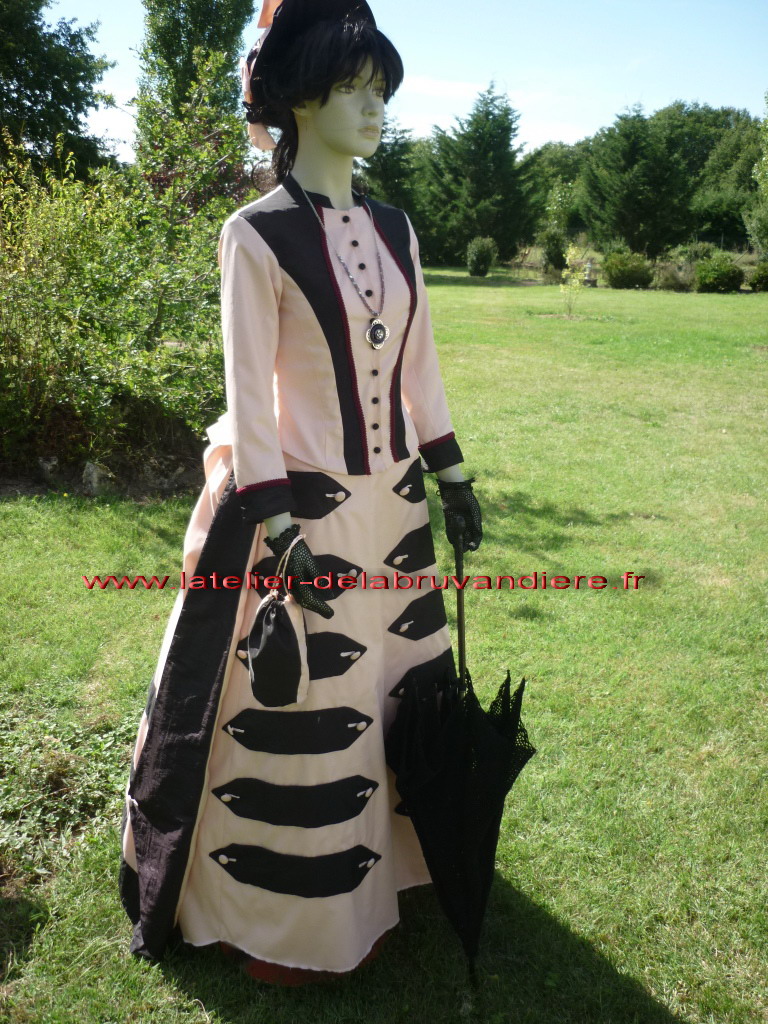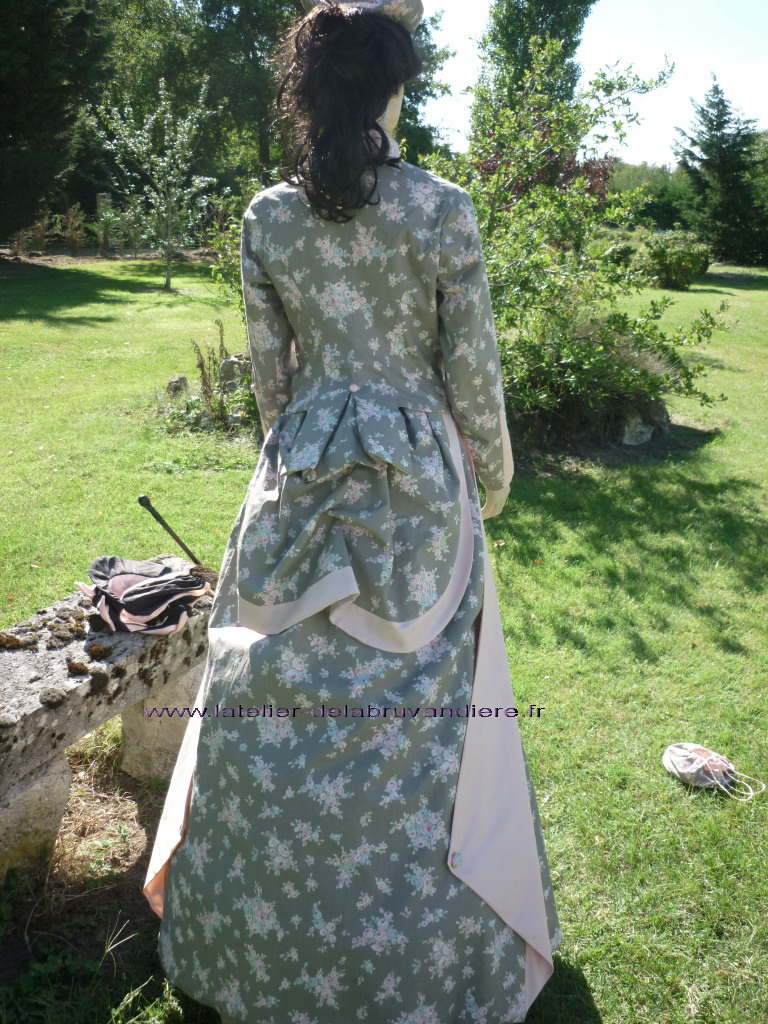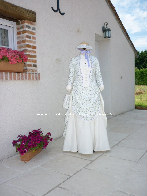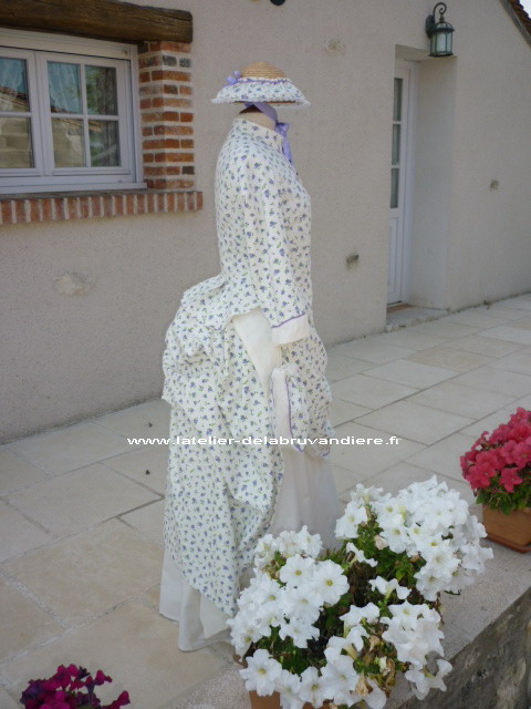 et bordé de dentelle blanche. La veste, la tournure et le tablier sont