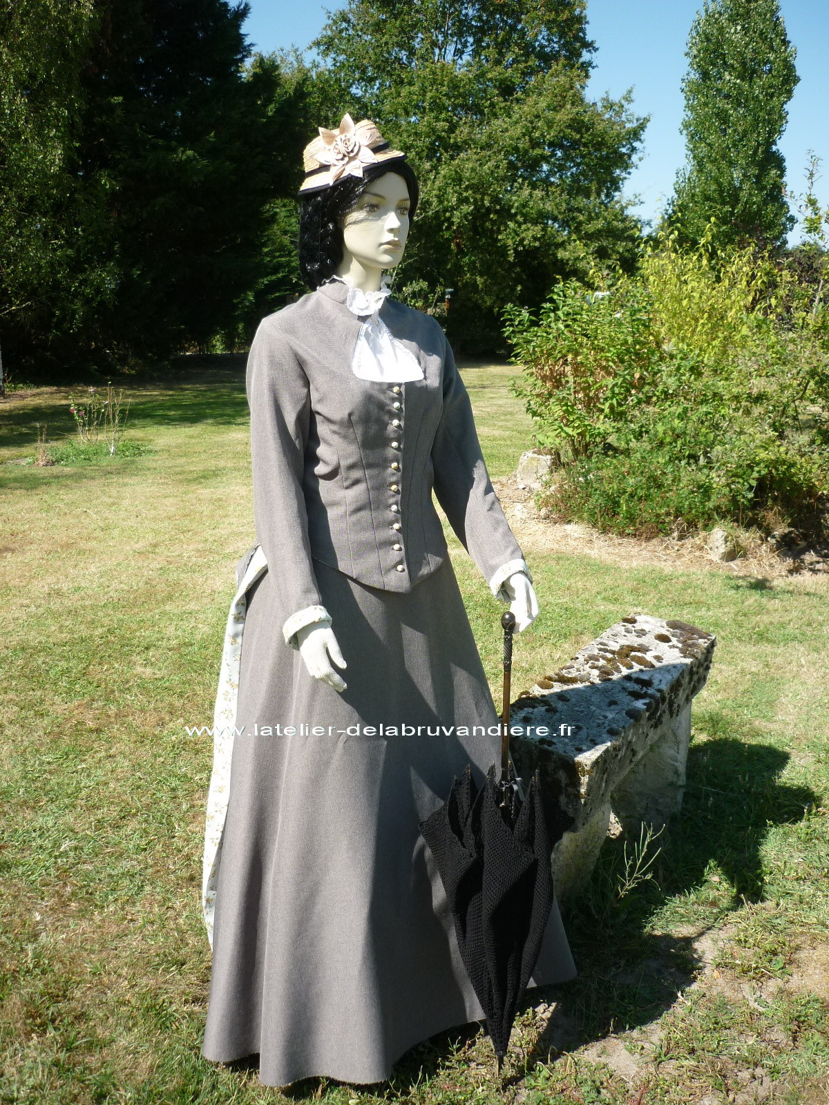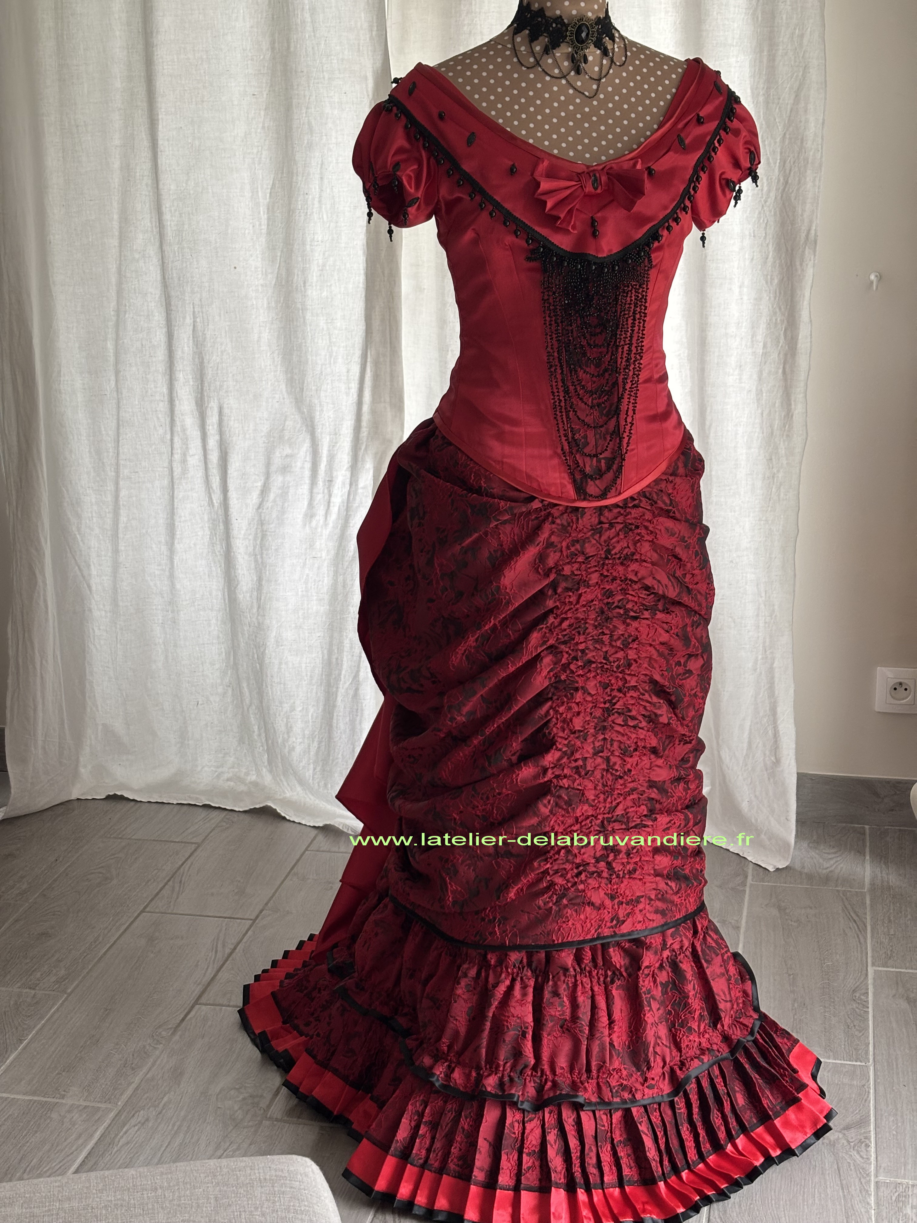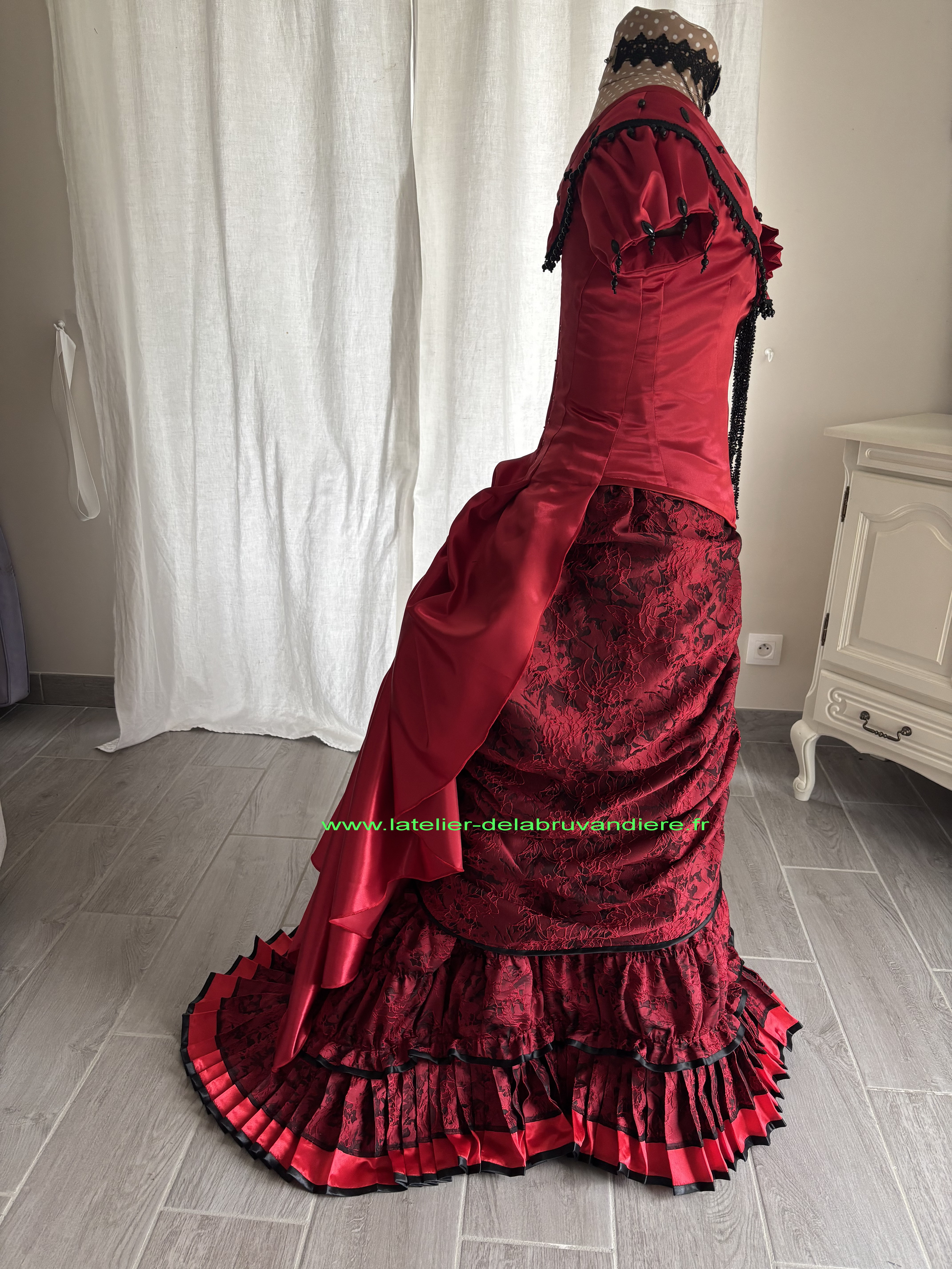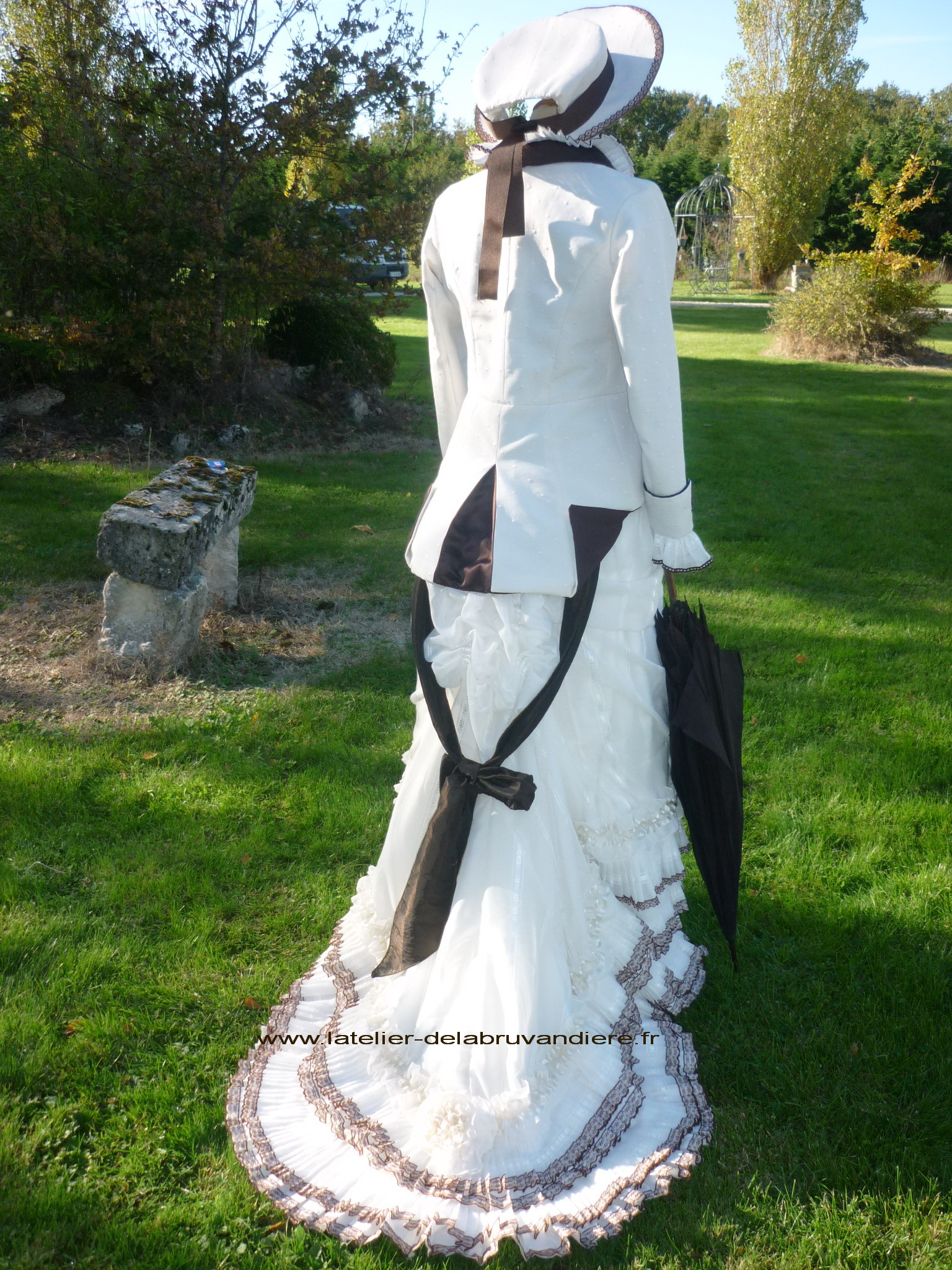 et bordé de dentelle blanche. La veste, la tournure et le tablier sont