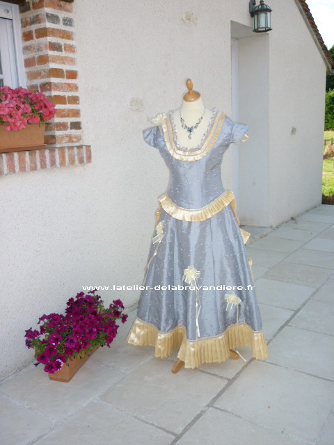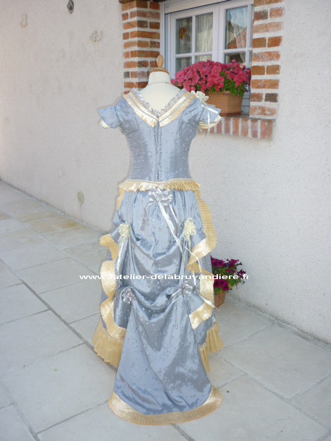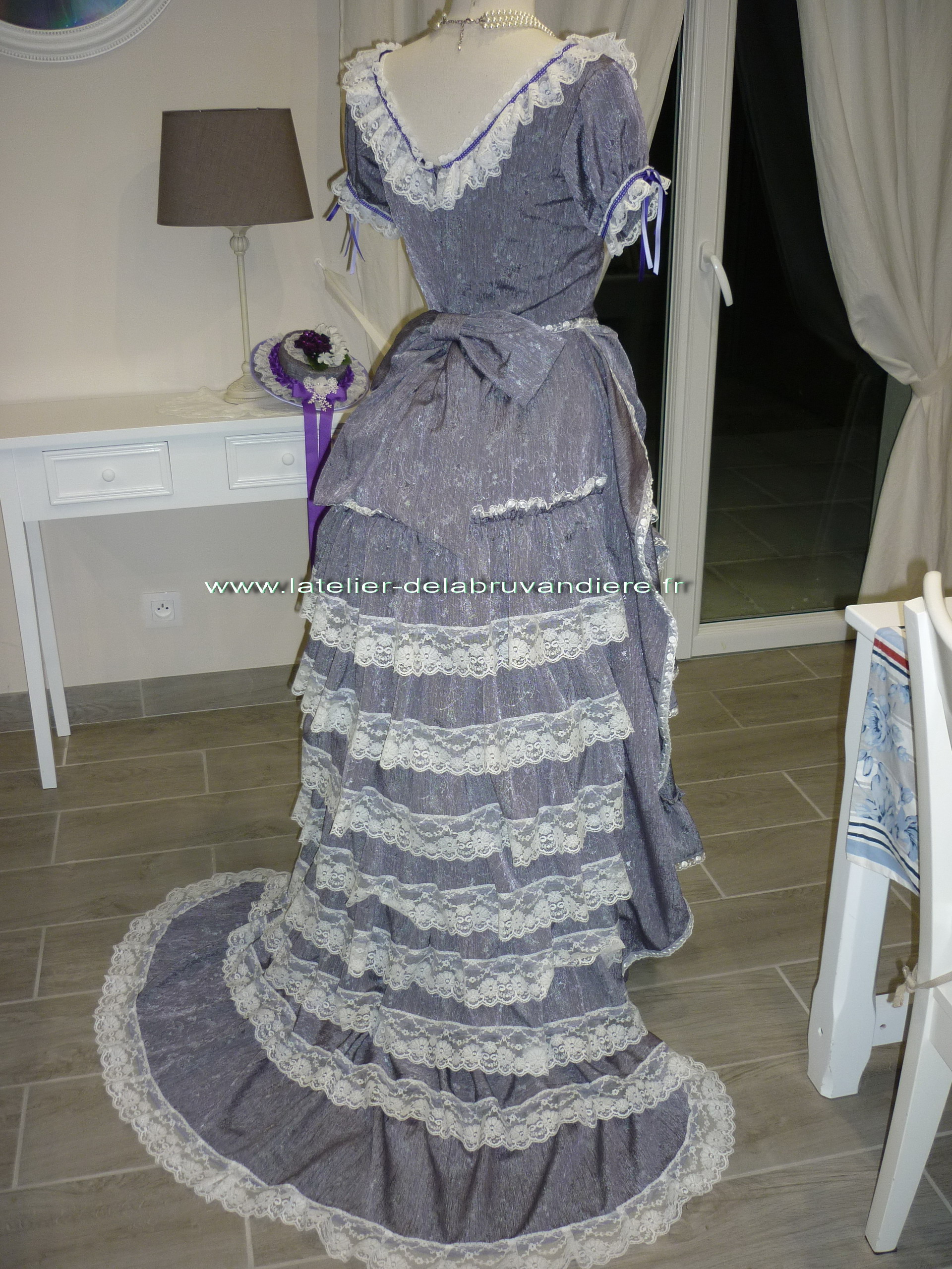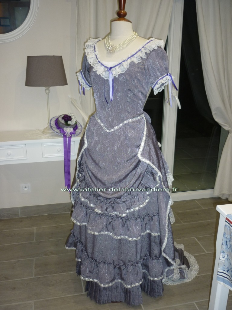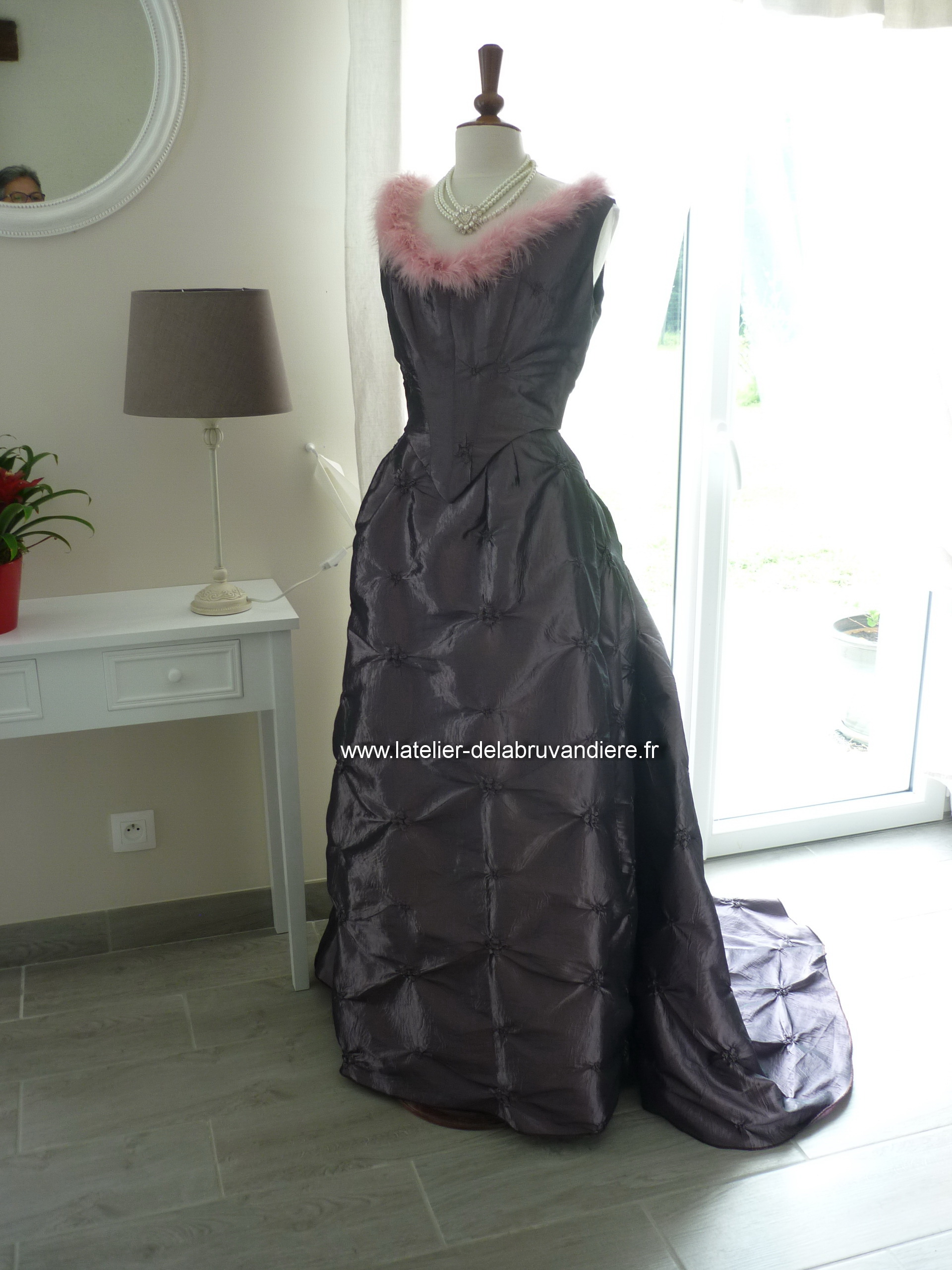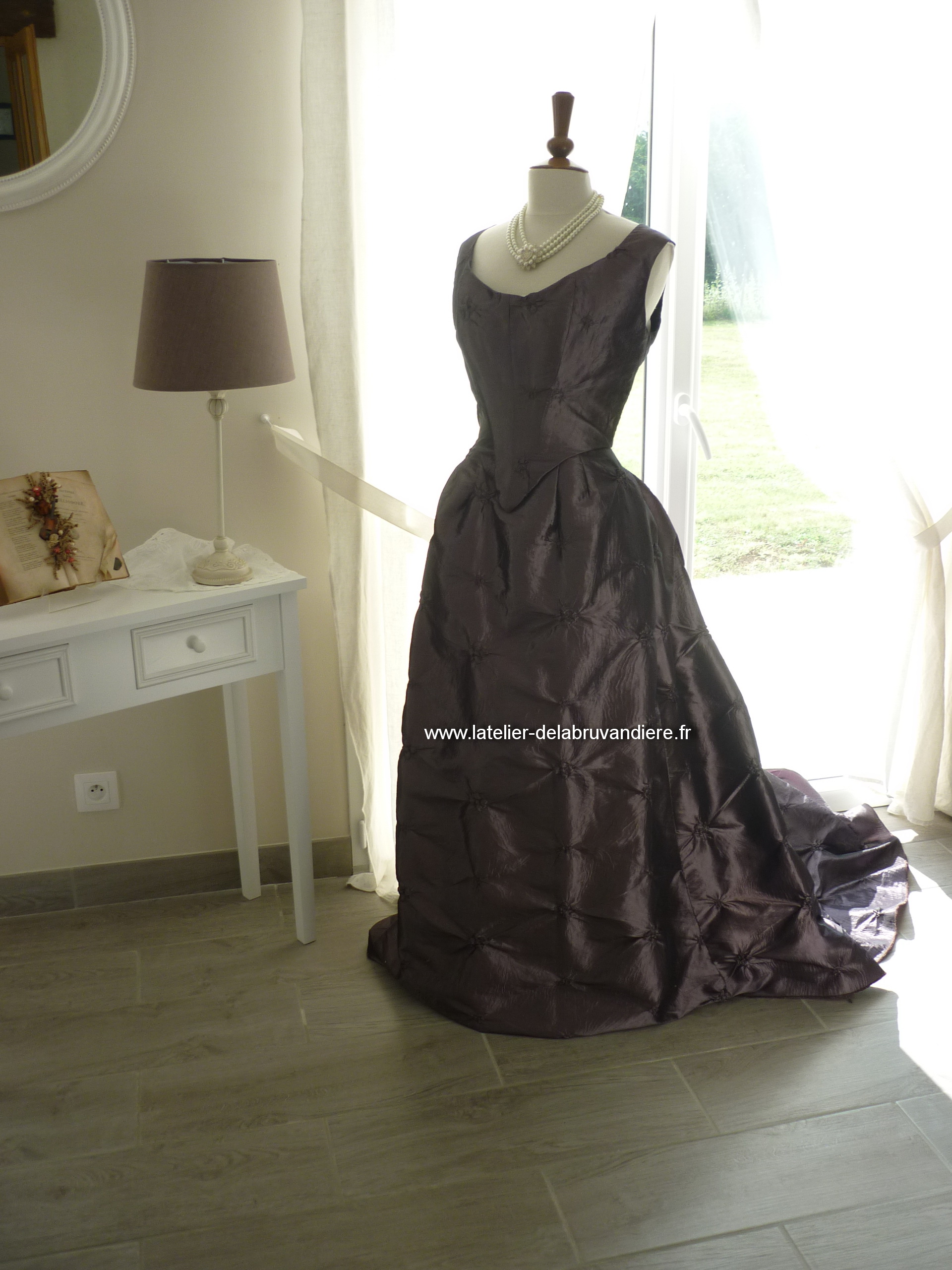 Elle est réalisée en taffetas broché violine. Le corsage est simple.il