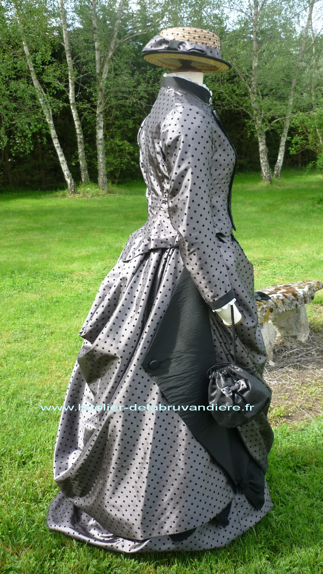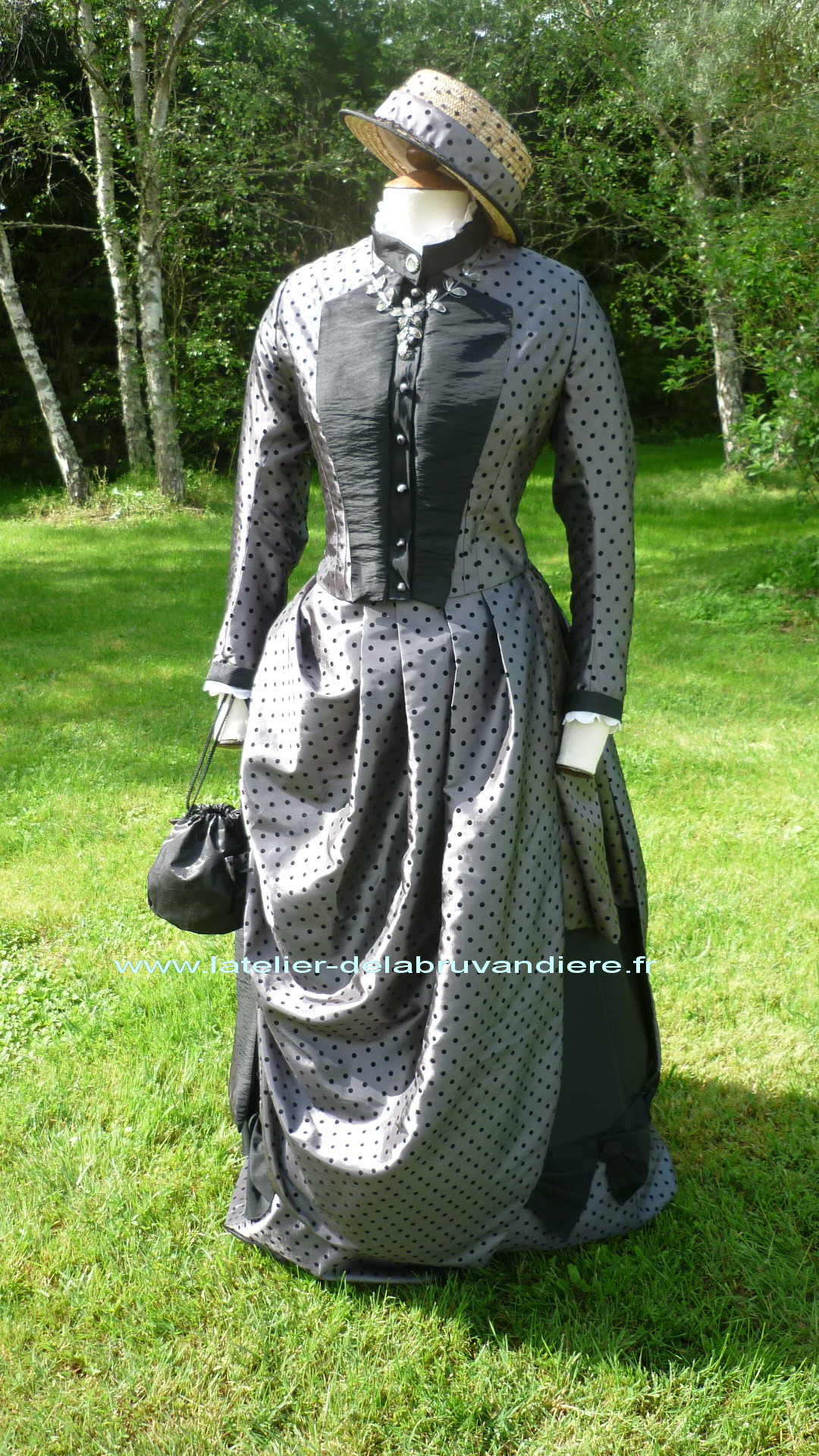 Réalisée en taffetas gris à pois et noir. Un