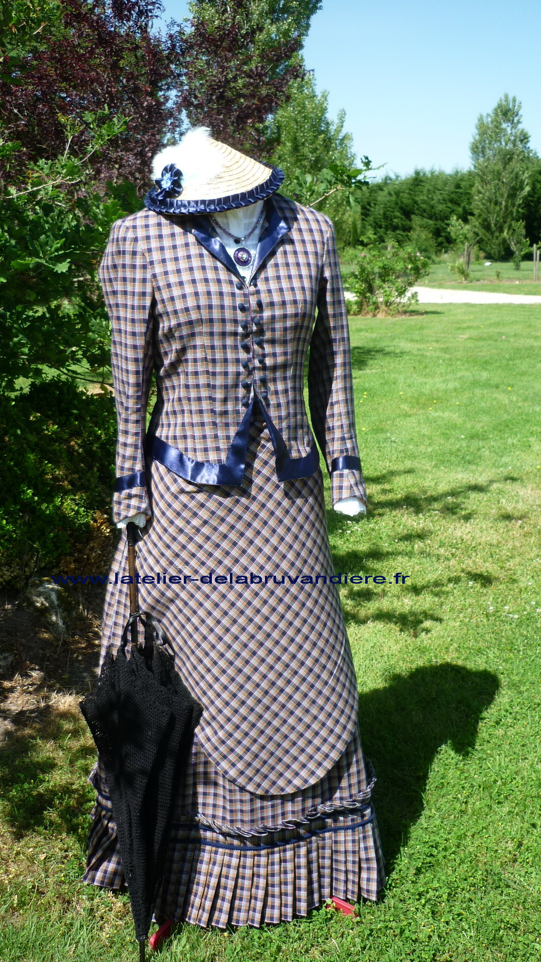 Ensemble en coton écossais et satin bleu, plissé