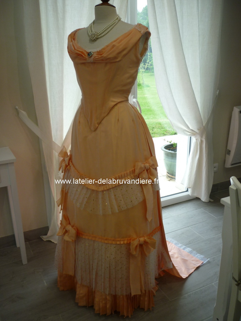 Elle est réalisée en taffetas saumon et en tulle Le corsage est agrémenté